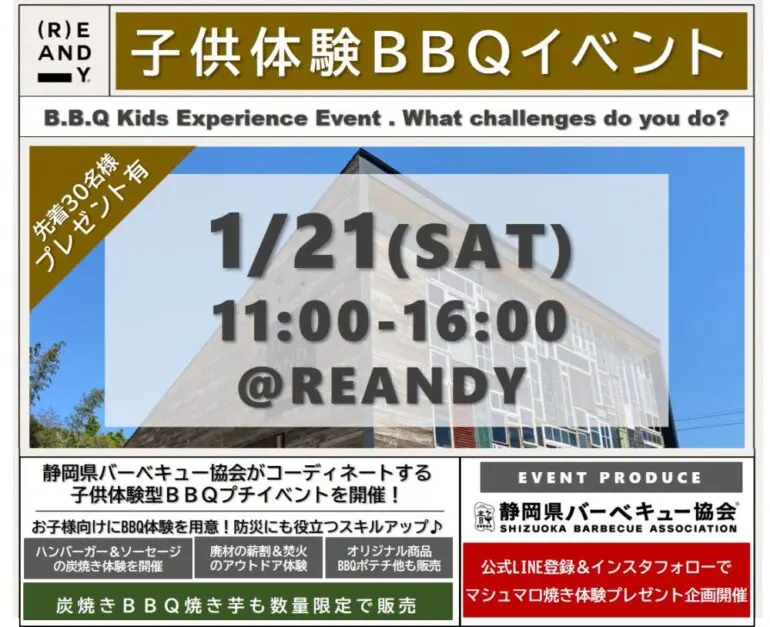 2023年1月21日(土)浜松市西区にあるREANDY/リアンディでBBQブース出店!